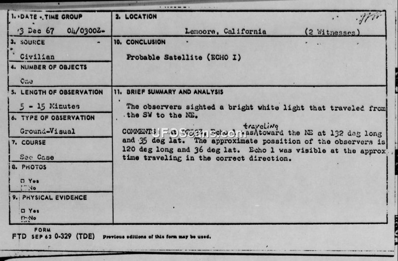 Two civilian witnesses reported a bright white light moving in the sky over Lemoore, California, on December 3, 1967. The U.S. Navy investigated the incident and concluded the object was likely the Echo I satellite, possibly compounded by an optical illusion or a weather balloon.