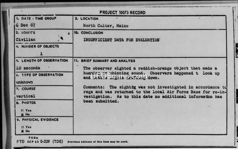 A 1967 UFO sighting report from North Cutler, Maine, involving two student witnesses who observed a reddish-orange object. The case was marked as having insufficient data for evaluation due to an inadequate initial investigation.