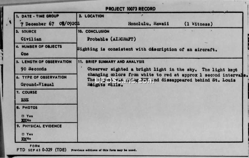 Project 10073 Record — Sighting Report, Honolulu, Hawaii, 7 December 1967
