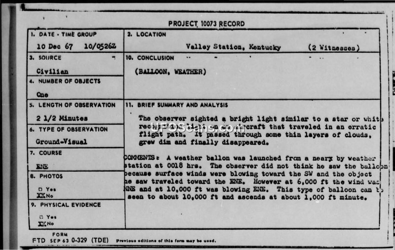 This document contains a Project Blue Book sighting report from 10 December 1967, involving a civilian witness, Steven Ellis, in Valley Station, Kentucky. The witness, a 17-year-old student with an interest in military aircraft, reported observing a self-luminous, white, point-like object with fuzzy edges for approximately two and a half minutes. He described the object as moving in an erratic, spiraling flight pattern before accelerating directly away from his position at a 60-degree angle of elevation. The sighting occurred at a drive-in theatre under completely overcast conditions with light rain. The witness attempted to verify the object with the local traffic control tower at Standiford Field, which reported no radar contacts and no weather balloons launched at that time. The Air Force subsequently concluded the object was a weather balloon. The witness strongly contested this finding, performing his own analysis using a map, compass, and protractor, and obtaining wind data from the local Weather Bureau. He argued that the wind direction at the time would have carried any weather balloon in the opposite direction of the object's observed path. The file includes correspondence from the Foreign Technology Division requesting the witness complete the formal questionnaire, as well as internal requests for weather data to evaluate the report.