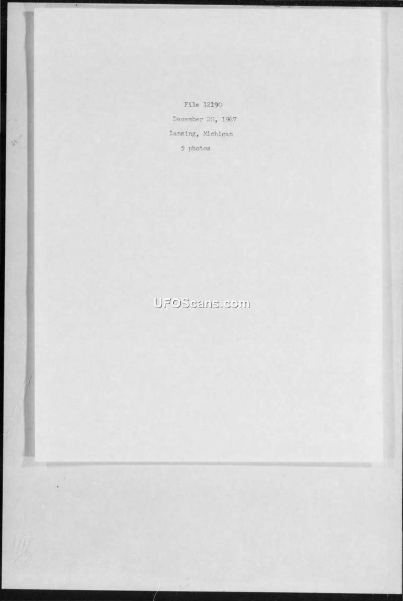 This document, identified as File 12190, serves as a record for a sighting incident that occurred in Lansing, Michigan, on December 20, 1967. The file consists of a cover page detailing the location, date, and the inclusion of five photographic images. The subsequent pages of the document contain these five photographs, which depict a dark, elongated object visible against a bright, hazy sky. No further descriptive text, witness testimony, or official analysis is provided within the document to explain the nature of the object or the circumstances of the sighting.