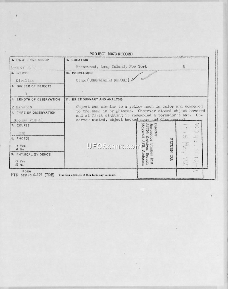 This document contains a Project 10073 record regarding a UFO sighting reported by a civilian in Brentwood, Long Island, New York, during the summer of 1967. The witness described a single object that appeared similar to a yellow moon in color and brightness. Upon initial observation, the object was reported to be hovering and was described as resembling a 'toreador's hat.' The witness further stated that the object backed away and disappeared. The total duration of the observation was reported as two minutes. The report was subsequently classified as an 'unreliable report' by the Foreign Technology Division. Correspondence included in the file shows that the witness wrote to Project Blue Book at Wright-Patterson Air Force Base requesting information on how to file a report, noting that they also believed they had contact with an alien being. Colonel James C. Manatt of the Foreign Technology Division responded on September 27, 1967, informing the witness that the information provided was insufficient for a scientific evaluation and requesting that they complete an FTD Form 164.