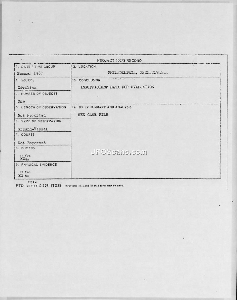 A civilian reported a UFO sighting in Philadelphia in the summer of 1967. The Air Force determined the initial report lacked sufficient data and requested the witness complete an AF Form 117 for further investigation.