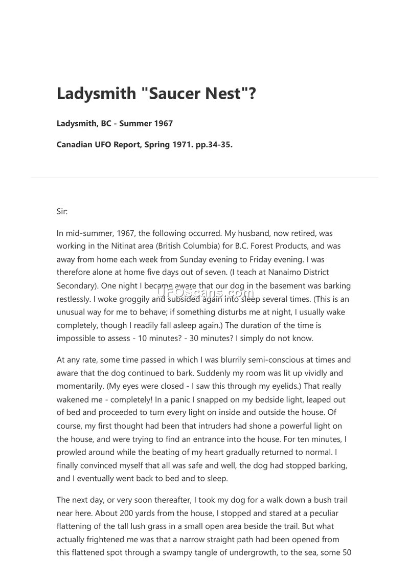 This document, published in the Canadian UFO Report in 1971, details two separate incidents reported by Mrs. Margaret A. Smith of Ladysmith, British Columbia, occurring in 1967. In the first incident, which took place in mid-summer 1967, Mrs. Smith was alone at home when her dog began barking restlessly in the basement. She experienced a period of semi-consciousness, followed by a vivid, momentary illumination of her room, which she perceived through her closed eyelids. Upon investigating the next day, she discovered a patch of flattened grass and a narrow, straight path leading through a swampy area toward the sea. She later identified this as a 'saucer nest' after seeing a similar image in a UFO paperback. The second incident occurred in mid-September 1967. While looking out over the Stuart Channel, Mrs. Smith observed a large, pulsating, and vibrating light that she initially mistook for a bonfire on the opposite shore. The object, which displayed a blending of colors rather than a single white light, moved slowly southward over the water for approximately a minute and a half before disappearing from view. She reported hearing no sound during this observation.