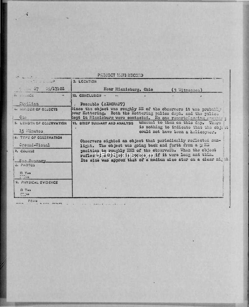 This document contains a collection of records regarding an unidentified flying object (UFO) sighting reported on 9 November 1967, near Miamisburg, Ohio. The primary witness, a research chemist at the Monsanto Research Corporation, reported observing a small, high-altitude object that appeared to be cigar-shaped and metallic. The witness described the object as remaining stationary for several minutes at a time, while also moving back and forth. The object periodically reflected sunlight, which led the witness to believe it was rotating slowly. The witness estimated the object's altitude at approximately 30,000 feet and noted that it did not make any sound. The sighting lasted for approximately 15 to 20 minutes. The witness was prompted to report the sighting after a colleague in another office noticed the object and drew attention to it. The Air Force's Foreign Technology Division (FTD) at Wright-Patterson Air Force Base initiated an investigation, sending multiple letters to the witness requesting the completion of an AF Form 117 questionnaire. The FTD also contacted the Miamisburg and Kettering Police Departments to inquire if they had received any reports of unusual objects on that date. Both police departments responded that they had no record of such a sighting. The Miamisburg Police Department noted that the weather on the day of the sighting was clear with temperatures in the low 40s. The documentation includes the completed sighting questionnaire, correspondence between the Air Force and the witness, and follow-up inquiries with local law enforcement, ultimately resulting in no definitive explanation for the phenomenon.