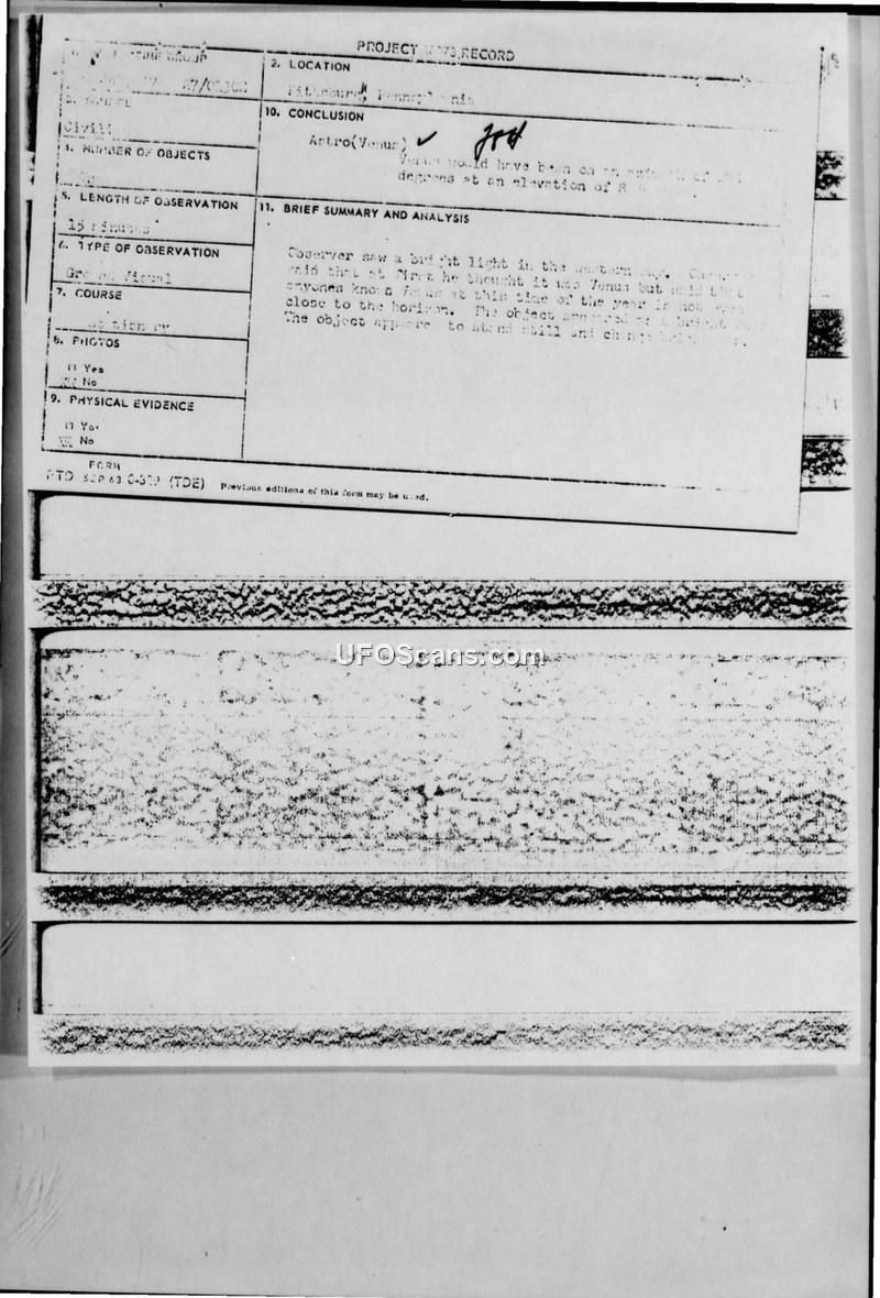 A 1967 UFO sighting report from Pittsburgh, Pennsylvania, was investigated by the Air Force. The official conclusion identified the object as the planet Venus.