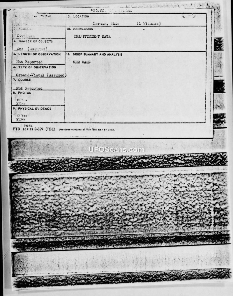 A railroad worker in Lorain, Ohio, reported a UFO sighting to the Veterans Service Office in September 1967. The Air Force requested further details via an FTD Form 164, but the case was ultimately closed as having insufficient data.
