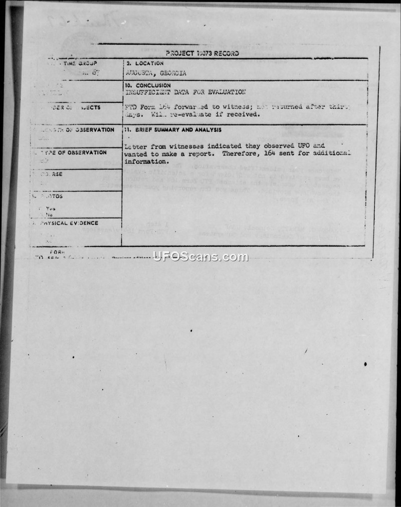 A witness reported a UFO sighting in Augusta, Georgia, in March 1967. The Air Force requested further information via FTD Form 164, but the form was never returned, leading to a conclusion of insufficient data.