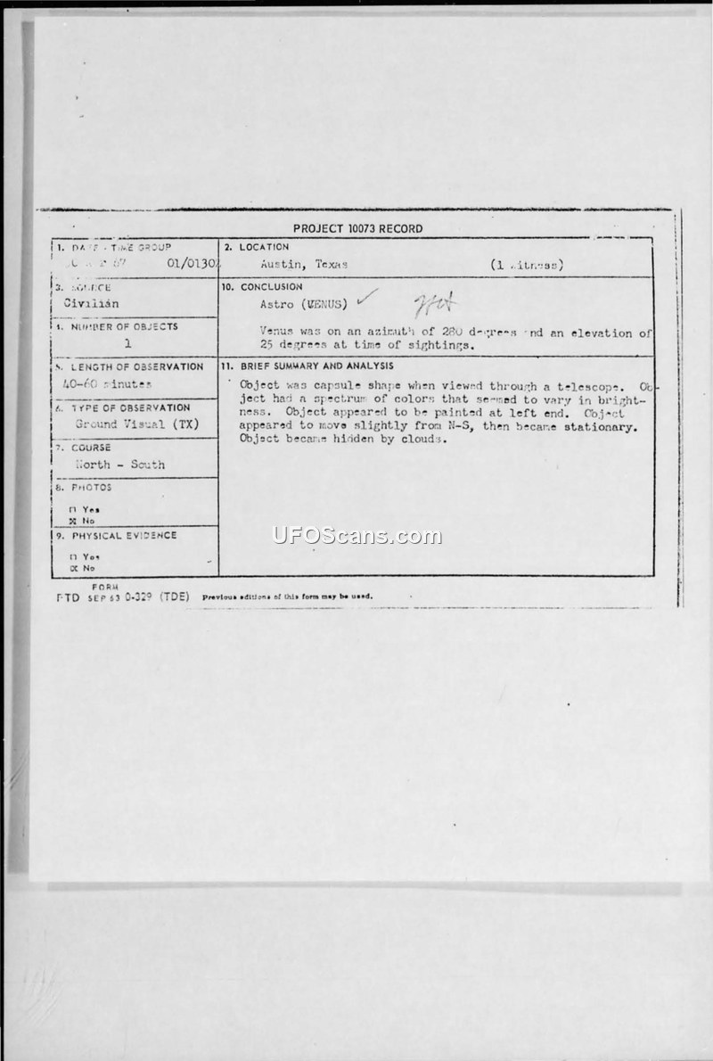 Project 10073 Record: Sighting Report - Austin, Texas, 1967