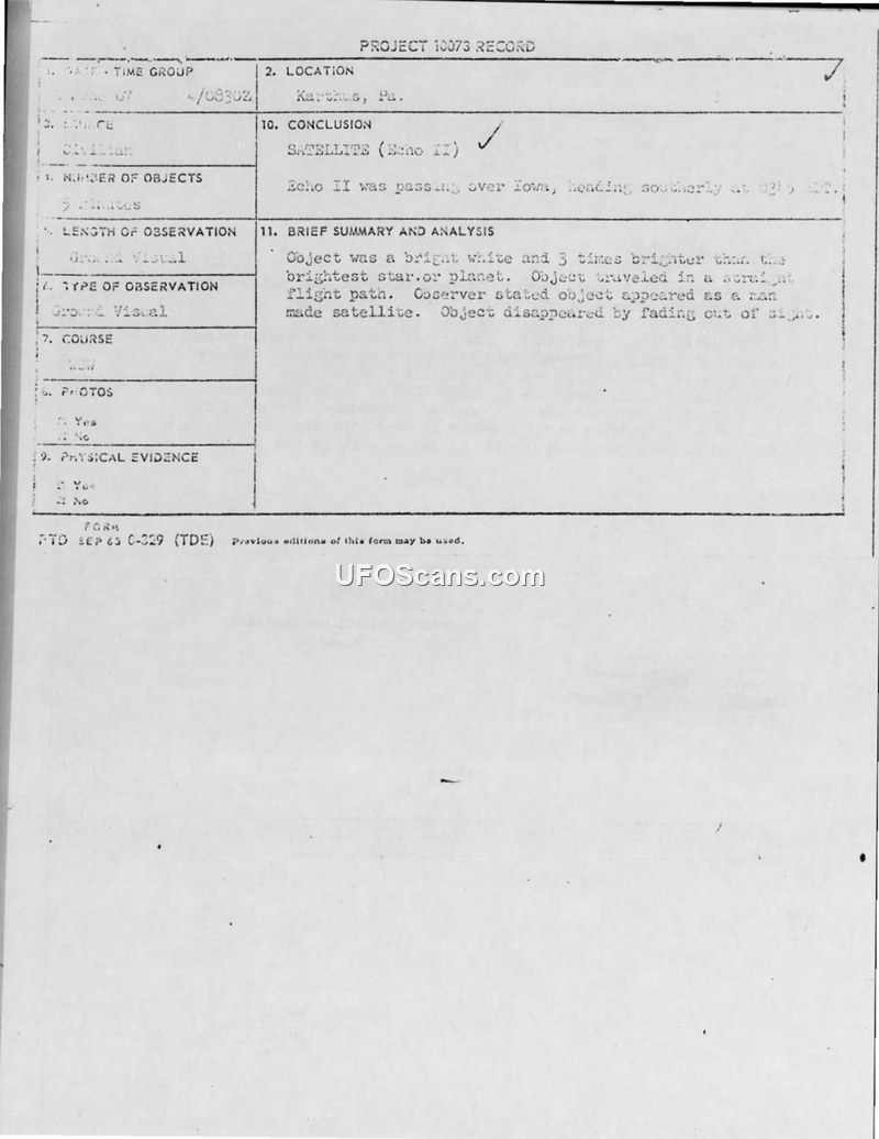 On June 7, 1967, Major Raymond Nelson, a U.S. Air Force Reserve officer and former WWII pilot, submitted a report regarding an unusual aerial object he observed on the morning of June 4, 1967, near Karthus, Pennsylvania. Major Nelson described the object as a brilliant light, approximately three times brighter than the brightest star or planet, which appeared at 03:30 A.M. at an elevation of 45 degrees. He noted that the object moved from the NNW to the WSW over the course of a few minutes before fading from view. Nelson, who had completed college-level astronomy coursework, suggested it might have been an American or Russian satellite. The Air Force Foreign Technology Division (FTD) initially responded to Nelson on June 21, 1967, stating that the information provided was insufficient for a scientific evaluation and requesting he complete an FTD Form 164. Following the submission of the questionnaire, the Air Force conducted an investigation. On July 12, 1967, Lt. Colonel Barnett B. Young of the Office of Information informed Major Nelson that the investigation concluded he had likely observed the Echo II satellite. The Air Force analysis noted that the satellite, with an estimated stellar magnitude of -1.0, would have been visible in the area at the time of the sighting and that its disappearance in the WSW was consistent with the satellite entering the Earth's shadow at approximately 35.6 degrees latitude.
