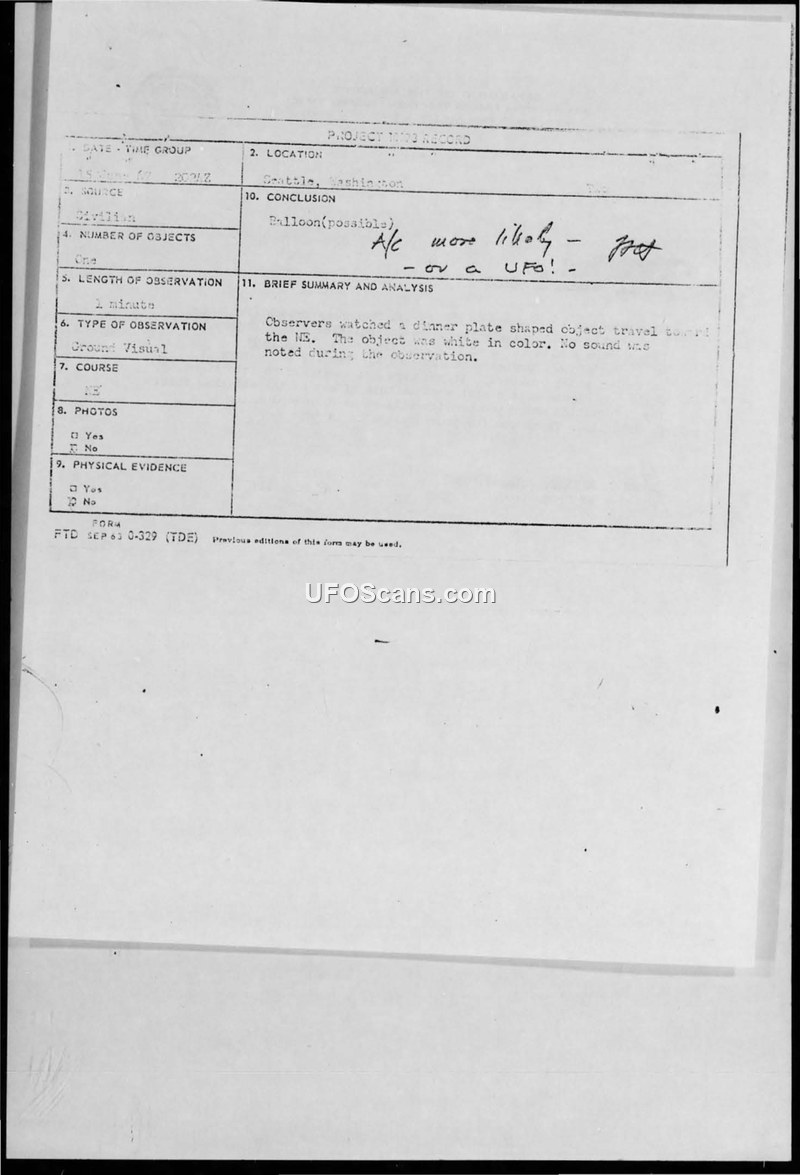 A 13-year-old witness reported a hovering, white, dinner-plate-shaped object in Seattle on July 15, 1967. The Air Force officially classified the event as a possible balloon, despite internal handwritten notes questioning this assessment.