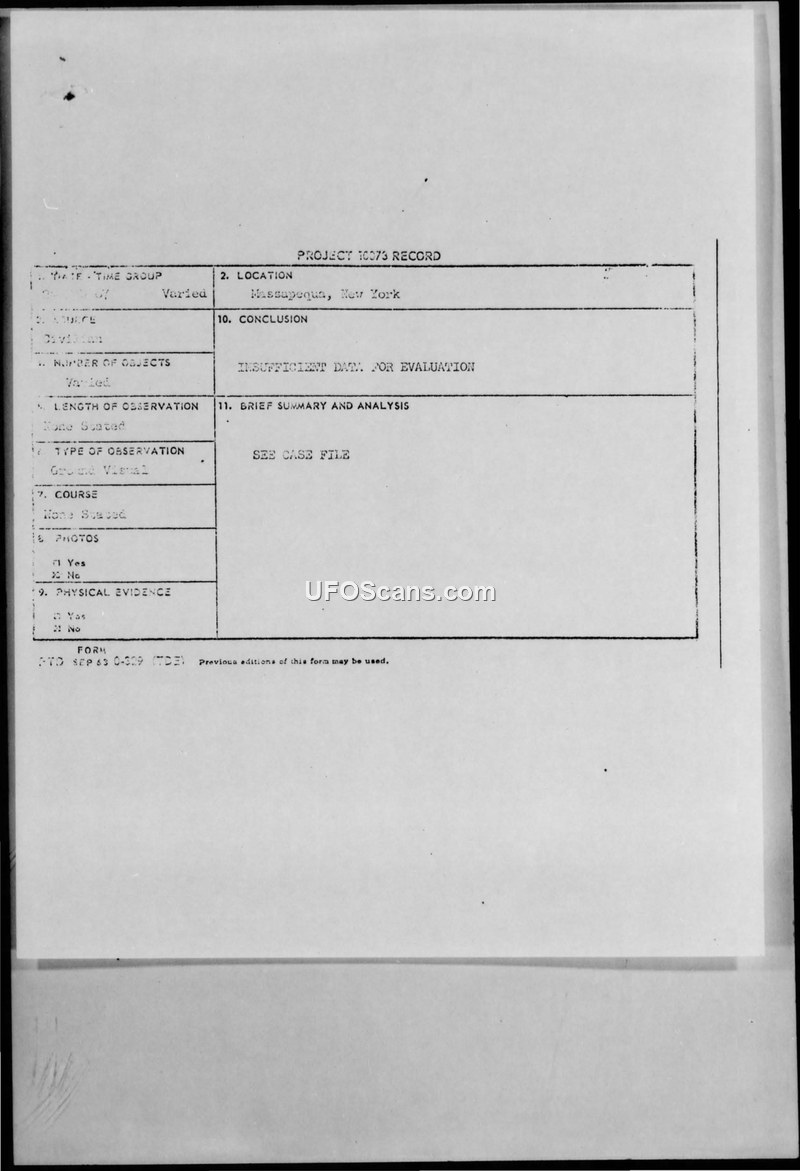 Project 10073 Record — UFO Observation, Massapequa, New York