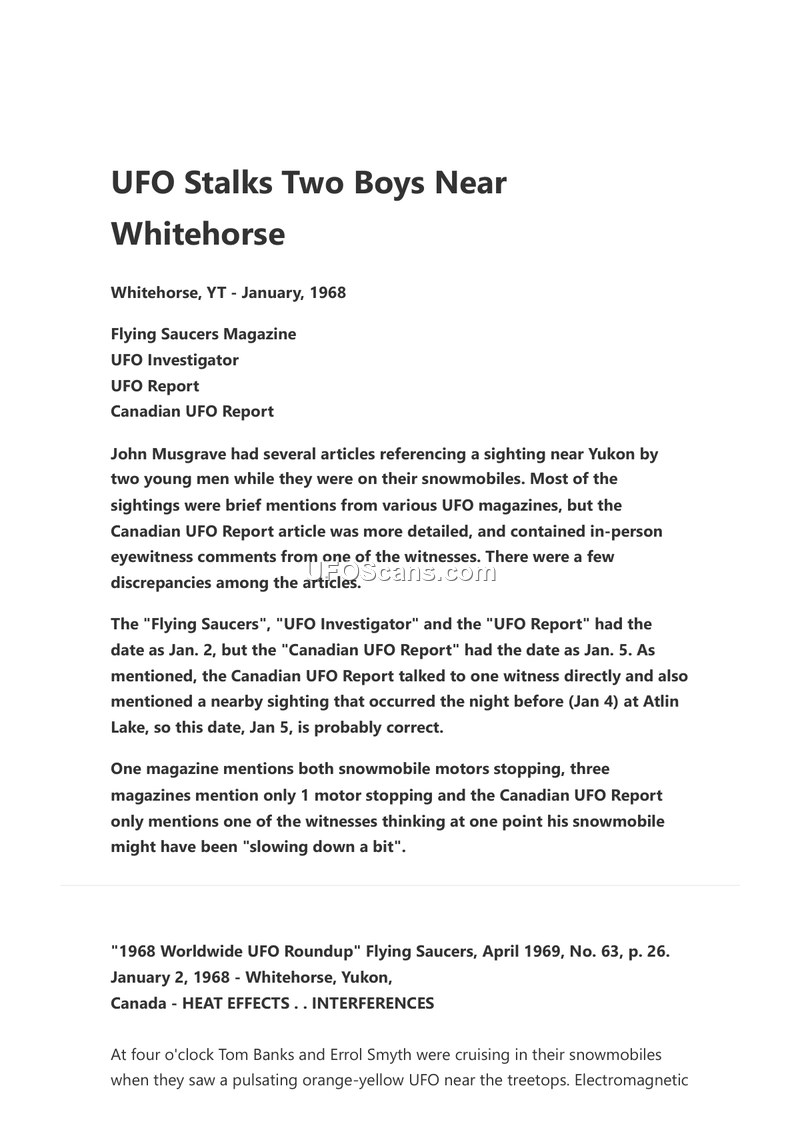 This document compiles various reports and articles regarding a UFO sighting that occurred in January 1968 near Whitehorse, Yukon. The primary incident involved two youths, 15-year-old Tommy Banks and 17-year-old Errol Smythe, who were riding snowmobiles on the lower slopes of Grey's Mountain. According to the accounts, the boys observed a pulsating, egg-shaped object, approximately 10 by 20 feet in size, hovering near the treetops. The object was described as having two distinct bands of luminous color—red on the outside and yellowish-orange on the inside—and was noted to be noiseless. During the encounter, which lasted approximately 10 seconds, the witnesses reported feeling an unusual heat, and at least one of the snowmobiles experienced engine interference, described as stalling or slowing down. The boys reported the incident to the RCMP, but a subsequent investigation of the site by Errol's father and a clergyman yielded no physical evidence, as the object left no marks on the snow. The document highlights discrepancies in the reporting of the event across various UFO publications, specifically regarding the date of the sighting (January 2 versus January 5) and the extent of the mechanical interference experienced by the snowmobiles. The compilation also notes that a similar object was reportedly sighted the night before, on January 4, 1968, at Atlin Lake, located 100 miles southeast of Whitehorse. The document serves as a retrospective analysis of the event, drawing from sources such as the Canadian UFO Report, UFO Investigator, and other UFO-related literature.