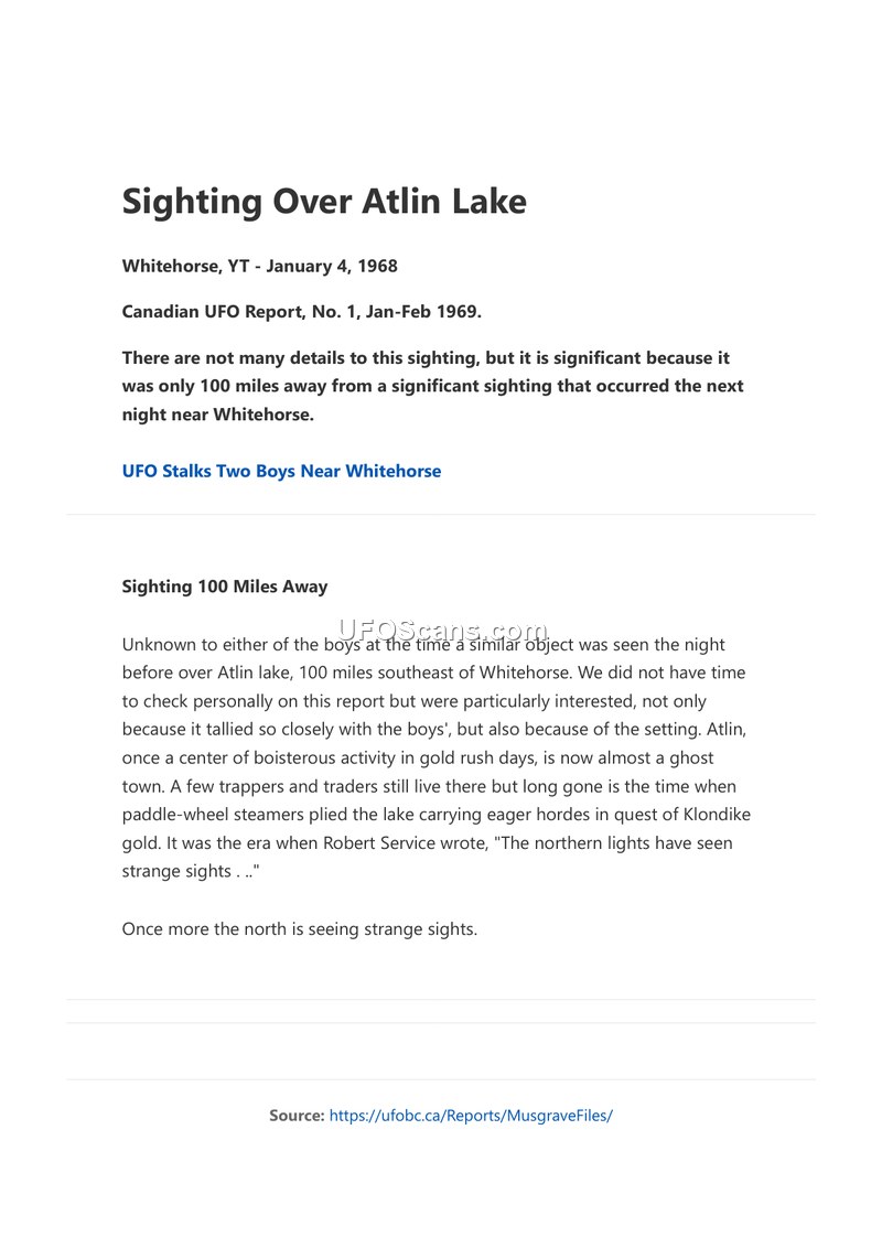 A UFO sighting was reported over Atlin Lake on January 4, 1968. The report highlights its proximity to a subsequent sighting near Whitehorse.