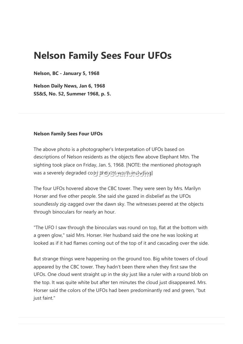This document is a 1968 newspaper report detailing a sighting of four UFOs by six witnesses in Nelson, BC. The witnesses observed the objects hovering and maneuvering near a CBC tower for nearly an hour.