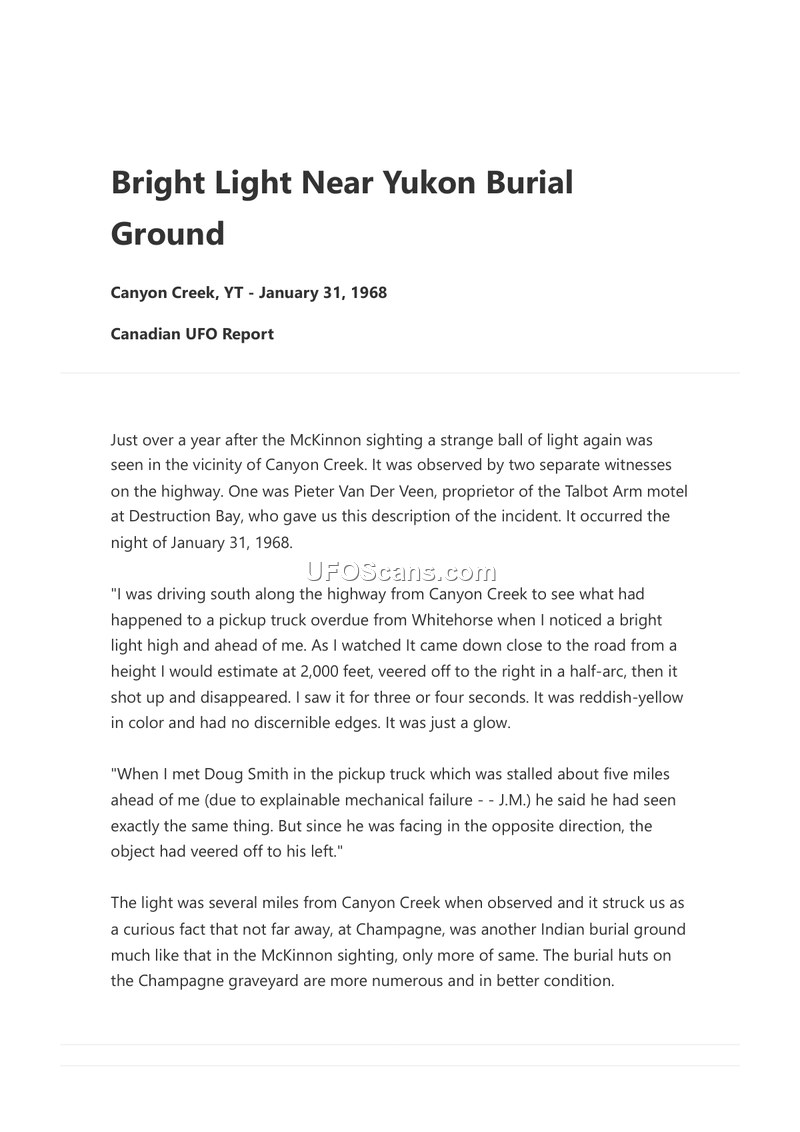 This document reports a January 1968 sighting of a luminous aerial object near Canyon Creek, Yukon, witnessed by two individuals. The report draws a thematic connection between the sighting location and a nearby indigenous burial ground.