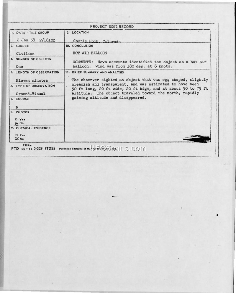 A reported UFO sighting in Castle Rock, Colorado, on January 2, 1968, was officially identified as a homemade hot air balloon constructed by two teenagers. The investigation involved the Air Force's Aerial Phenomena Office and local authorities.