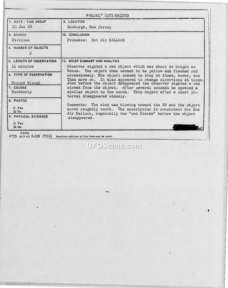 Project 10073 Record: UFO Report - Newburgh, New Jersey, 10 Jan 68