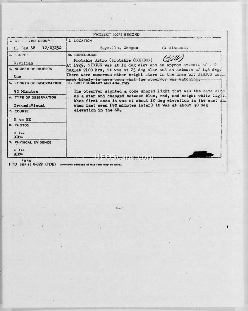 A 1968 UFO sighting in Mayville, Oregon, by a commercial pilot was investigated by the Air Force's Project Blue Book. The object was officially identified as the star Sirius.