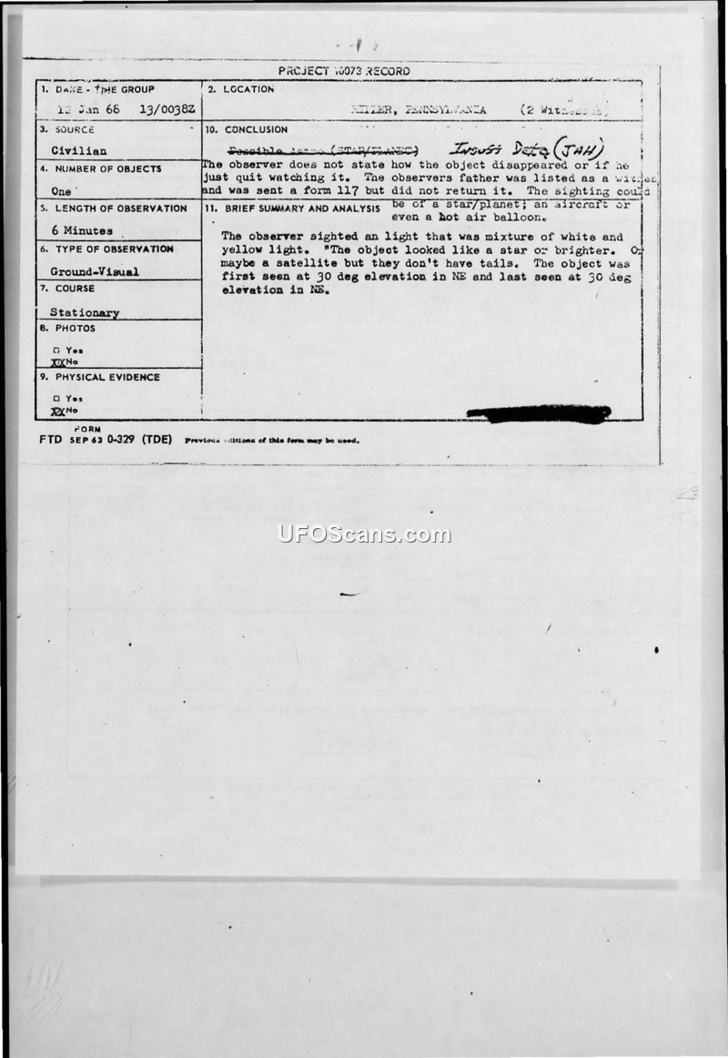Project 10073 Record: UFO Observation, 12 January 1968