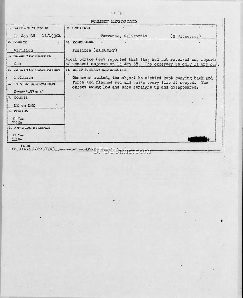 An 11-year-old in Torrance, California, reported a UFO sighting on January 14, 1968. The Air Force investigated, but local police had no corroborating reports, leading to a classification of 'Possible (AIRCRAFT).'