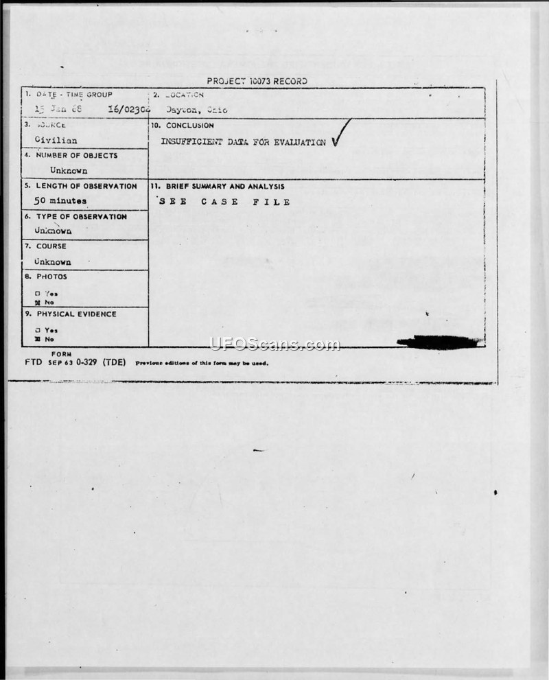 This document is a compilation of records from Project 10073, covering various Unidentified Aerial Phenomena (UAP) sighting reports from January 1968. The records include official Air Force technical information forms, correspondence between the Air Force and civilian investigators (specifically NICAP), and internal memoranda regarding the handling of these reports. A significant portion of the document details the Air Force's administrative process for managing UAP reports, including the transition to having intelligence officers investigate sightings. Several specific cases are documented, including a sighting in Dayton, Ohio, on January 15, 1968, and a sighting in Ipswich, Massachusetts, on January 17, 1968. The Ipswich case is particularly detailed, involving multiple witnesses who observed a solid object with lights that changed formation. The document also includes correspondence regarding a physical specimen recovered in Cypress Gardens, Florida, which was initially suspected to be a meteorite but was later identified by the Air Force as likely being volcanic rock (pumice). Throughout the document, the Air Force consistently concludes that most reports provided insufficient data for scientific evaluation, often attributing sightings to astronomical phenomena or misidentification. One notable entry includes a letter from a sixteen-year-old boy who confessed to faking UFO photographs using double exposure techniques, which the Air Force used as an example of how hoaxes were perpetrated.