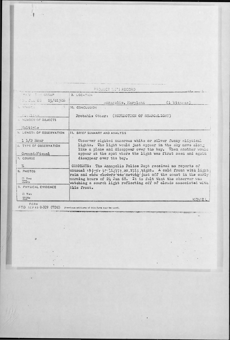 This document details a UFO sighting report from 24 January 1968, in Annapolis, Maryland. The witness, a secretary at the Air Force Office of Scientific Research (AFOSR), reported observing multiple white or silver, fuzzy, elliptical objects moving eastward over the bay for approximately 1.5 hours between 8:30 pm and 10:00 pm. The witness initially believed the objects were rockets being launched from a nearby Nike site, but later concluded they were not rockets or airplanes due to their frequency and movement patterns. The Air Force's Aerial Phenomena Office, led by Lt. Col. Hector Quintanilla, Jr., initiated an investigation into the report. They contacted the Annapolis Police Department, who stated they had received no reports of unusual objects on that date. Further investigation by the Environmental Technical Applications Center (MAC) provided meteorological data for the Annapolis area, noting a cold front with light rain and snow showers moving through the region on the night of the sighting. The official conclusion reached by the Air Force was that the observer had likely witnessed a ground-based searchlight reflecting off of low-hanging clouds associated with the cold front. The file includes correspondence between the Air Force and the Annapolis Police Department, as well as the completed questionnaire from the witness.