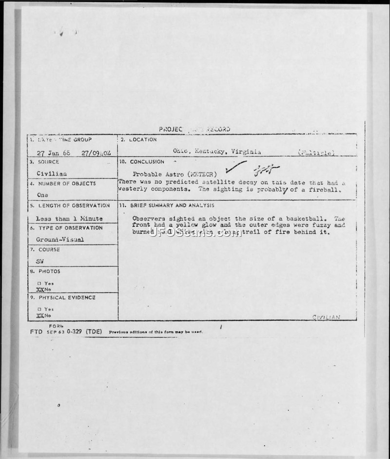On January 27, 1968, at approximately 04:39 A.M., Patrolman Eugene McRoberts and Patrolman Charles Kendall of the Maysville Police Department in Kentucky observed an unidentified flying object while on patrol on Highway 11. The witnesses described the object as being approximately the size of a basketball, with a yellow or orange glow in the center and fuzzy white outer edges. The object was observed at an altitude of 2,000 to 3,000 feet, traveling at a very high rate of speed on a level flight path in a southwestern direction. It featured a long trail of fire behind it and made no sound. The observation lasted less than one minute before the object dropped over the horizon. The incident was reported to the Maysville Police Department, and subsequent investigation by the Air Force's Aerial Phenomena Office (Project Blue Book) involved coordination with the Smithsonian Institution and the University of Colorado. While there was initial confusion regarding potential photographs of the object—with some speculation that they might be the result of static electricity—the official conclusion reached by the Air Force was that the phenomenon was a 'Probable Astro (METEOR).' This conclusion was supported by the absence of predicted satellite decay for that date and the visual characteristics reported by the witnesses, which were consistent with a fireball.