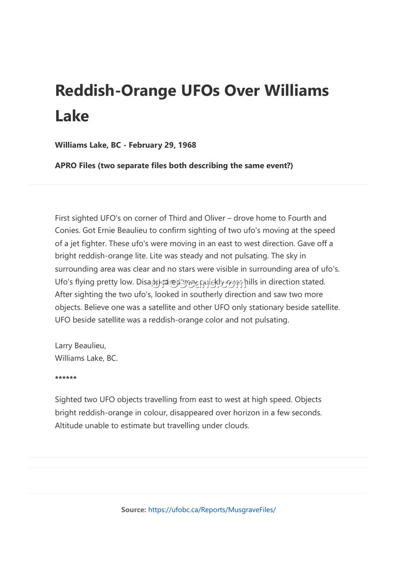 This document details a 1968 sighting of multiple reddish-orange unidentified objects in Williams Lake, BC, reported by Larry Beaulieu and confirmed by Ernie Beaulieu.