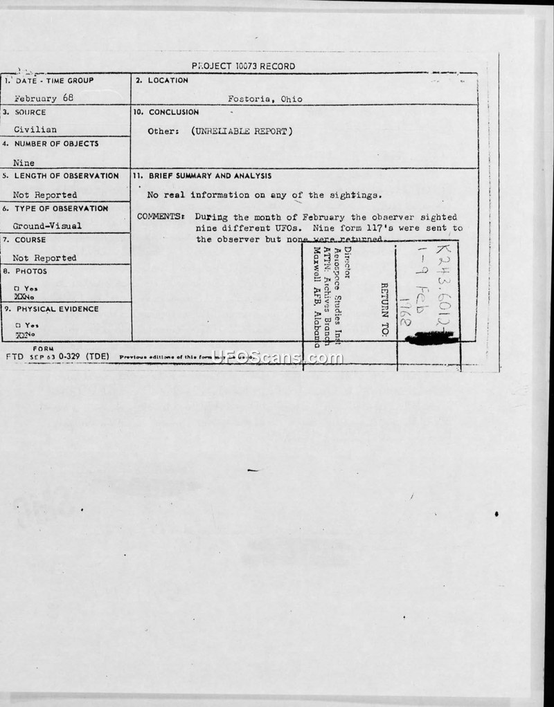 A civilian reported nine UFO sightings in Fostoria, Ohio, in February 1968. The report was classified as unreliable after the observer failed to return the required documentation forms.