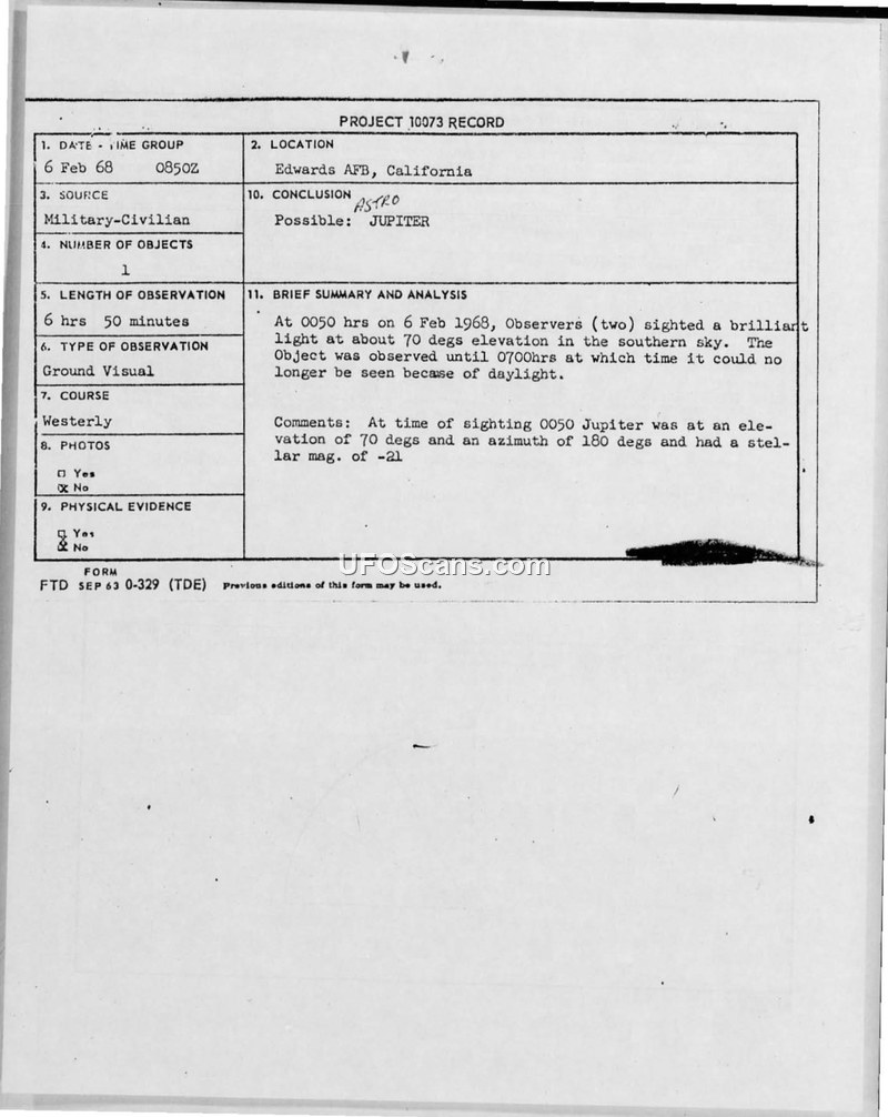 A weather observer at Edwards AFB reported a brilliant, stationary light on 6 February 1968. The Air Force concluded the object was the planet Jupiter.