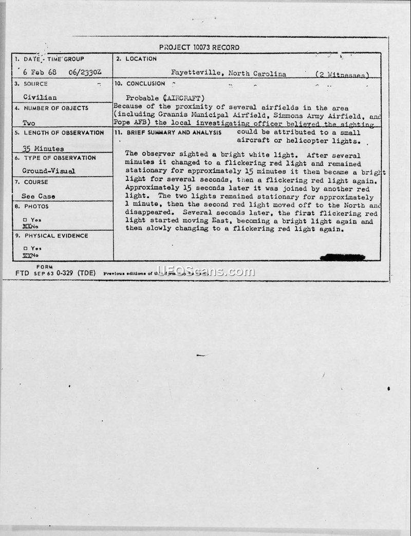 On February 6, 1968, an unidentified aerial phenomenon was reported in Fayetteville, North Carolina. The observer, a civilian, reported seeing two objects over a duration of 35 minutes. The sighting began with a bright white light that changed to a flickering red light and remained stationary for approximately 15 minutes. Subsequently, the light became bright again for several seconds before returning to a flickering red state. A second red light then joined the first, and both remained stationary for about one minute. The second light moved off to the North and disappeared, while the first light moved East, changing between bright and flickering red before also disappearing. The observer reported the event to Major Harwood at Pope Air Force Base. The official assessment, provided by Captain William H. Emmingham of the 464th Tactical Airlift Wing, concluded that the sighting was likely attributable to small aircraft or helicopter lights, citing the proximity of Grannis Municipal Airfield, Simmons Army Airfield, and Pope AFB.