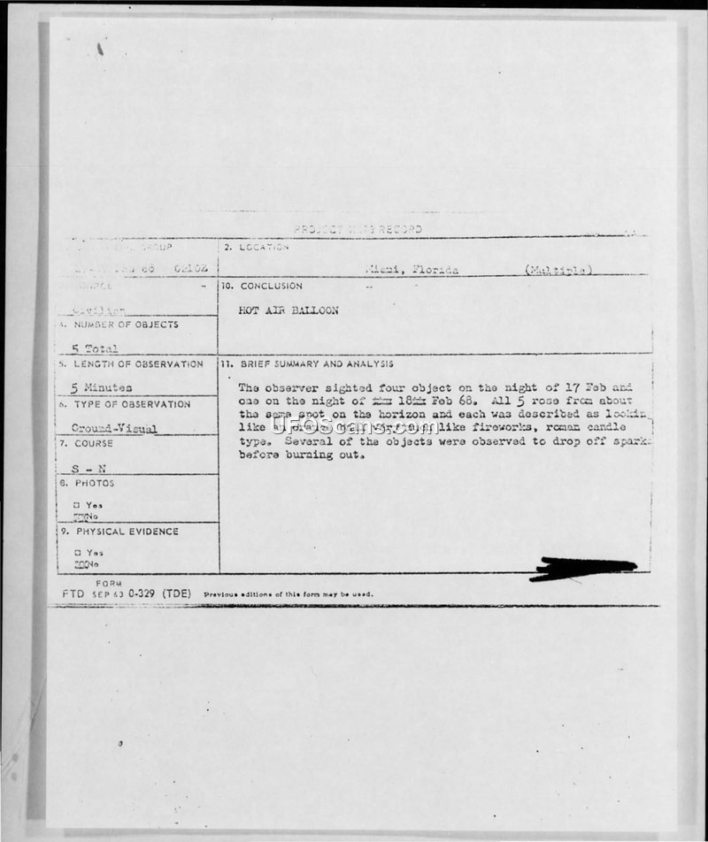 An Air Force investigation into a February 1968 sighting of five orange, flickering objects in Miami, Florida, concluded the phenomena were 'garmet bag hot air balloons.' The witness was a former Air Force pilot who provided detailed observations of the objects' behavior and appearance.