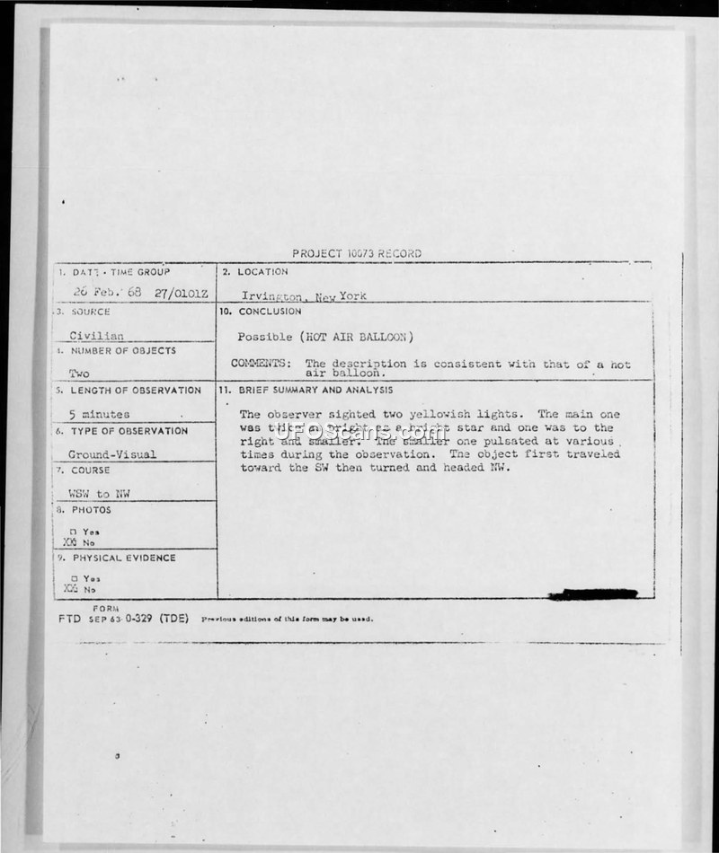 A 13-year-old witness reported two yellowish lights in Irvington, New York, in February 1968. The Air Force concluded the sighting was likely a hot air balloon.