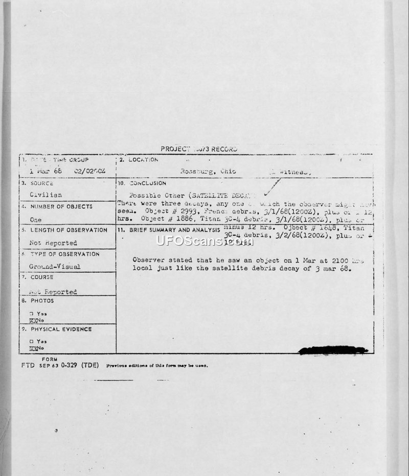 A civilian in Rossburg, Ohio, reported a UFO sighting on March 1, 1968. The Air Force concluded the event was likely caused by the decay of satellite debris.