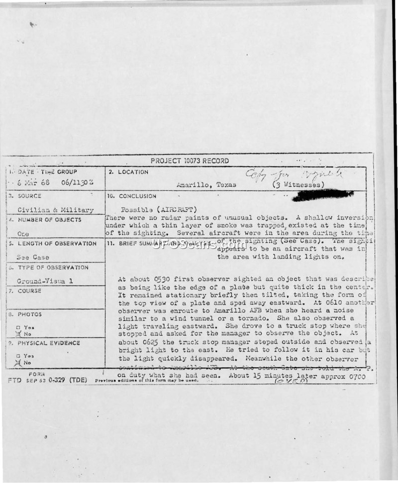 Project 10073 Record — Amarillo, Texas, 6 March 1968