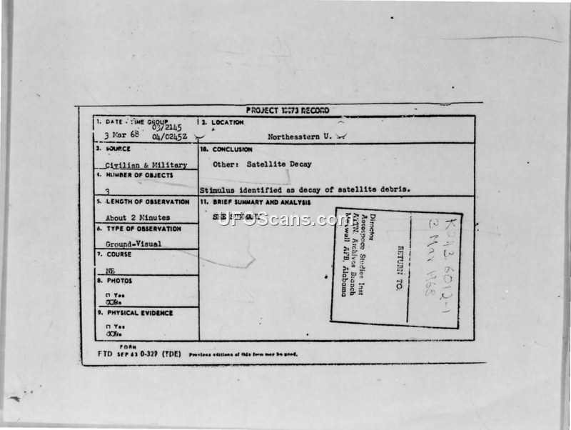 On March 3, 1968, numerous sightings of fiery objects across the Eastern U.S. were reported. The Air Force identified these as the re-entry of Soviet Zond-4 satellite debris.