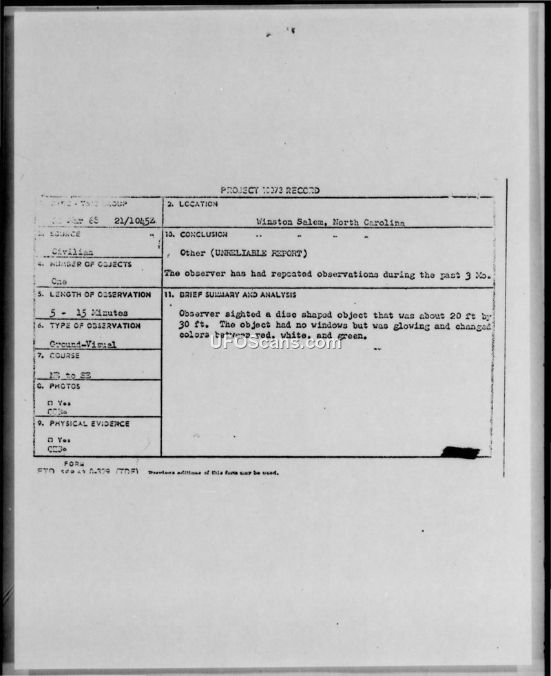 A military report from 1968 details a student's sighting of a glowing, disc-shaped object in Winston Salem, North Carolina. The Air Force classified the report as unreliable, citing the student's prior classroom focus on UFO topics as a likely influence.