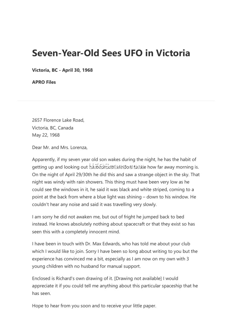 On May 22, 1968, a resident of 2657 Florence Lake Road in Victoria, British Columbia, identified as (Mrs.) M. Dornick, wrote a letter to Mr. and Mrs. Lorenza regarding a sighting reported by her seven-year-old son, Richard. According to the letter, the incident occurred on the night of April 29/30, 1968, during a period of windy weather and rain showers. The child, who had a habit of looking out his bedroom window during the night, observed a strange object in the sky. He described the object as being black and white striped, pointed at the back, and flying at a very low altitude. He noted that the object had visible windows and a blue light shining from the rear toward his window. The child reported that the object made no noise and traveled very slowly. Due to fear, the child did not wake his mother, but instead returned to bed. Mrs. Dornick stated that her son had no prior knowledge of spacecraft, suggesting his account was based on an innocent perspective. The author mentioned she had been in contact with Dr. Max Edwards, who referred her to the recipients' club, which she expressed an interest in joining. She also noted that she had enclosed a drawing made by her son, though the drawing was not available in the provided document. Mrs. Dornick requested information regarding the nature of the object her son had seen.