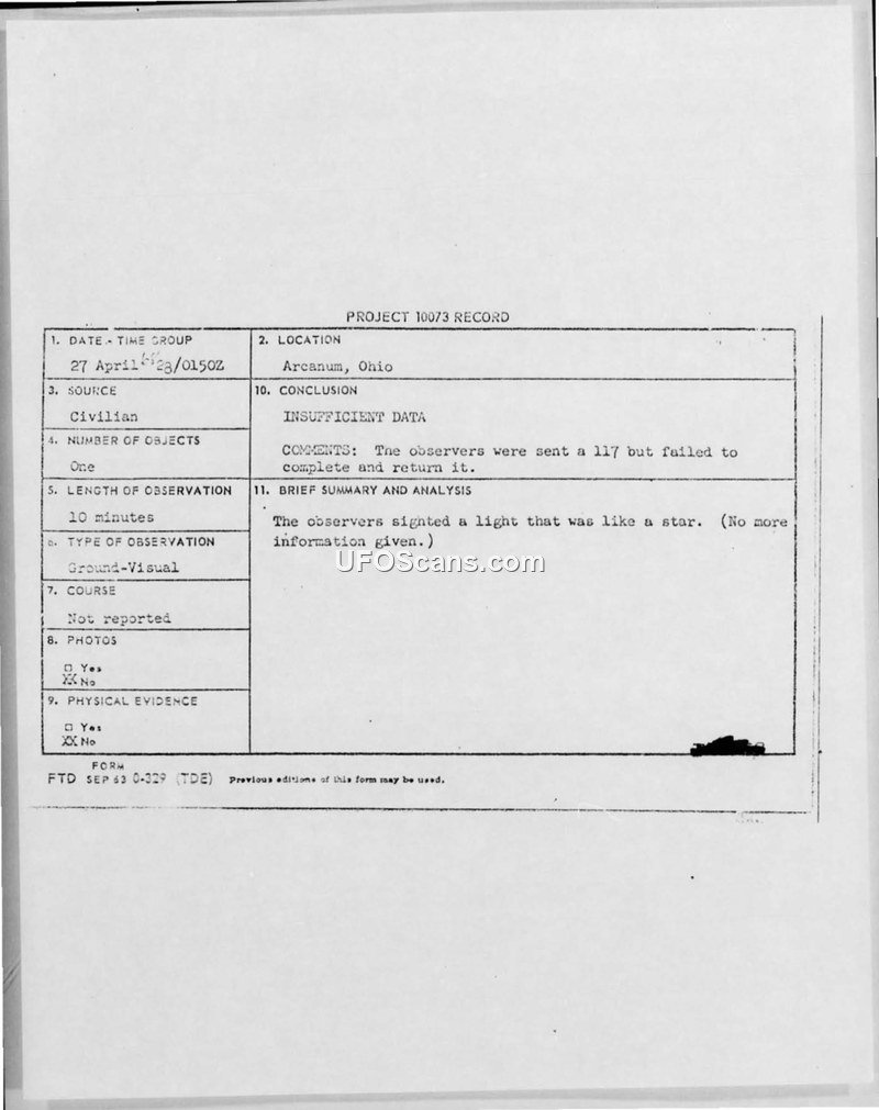 Project 10073 Record — Arcanum, Ohio, 27 April 1968