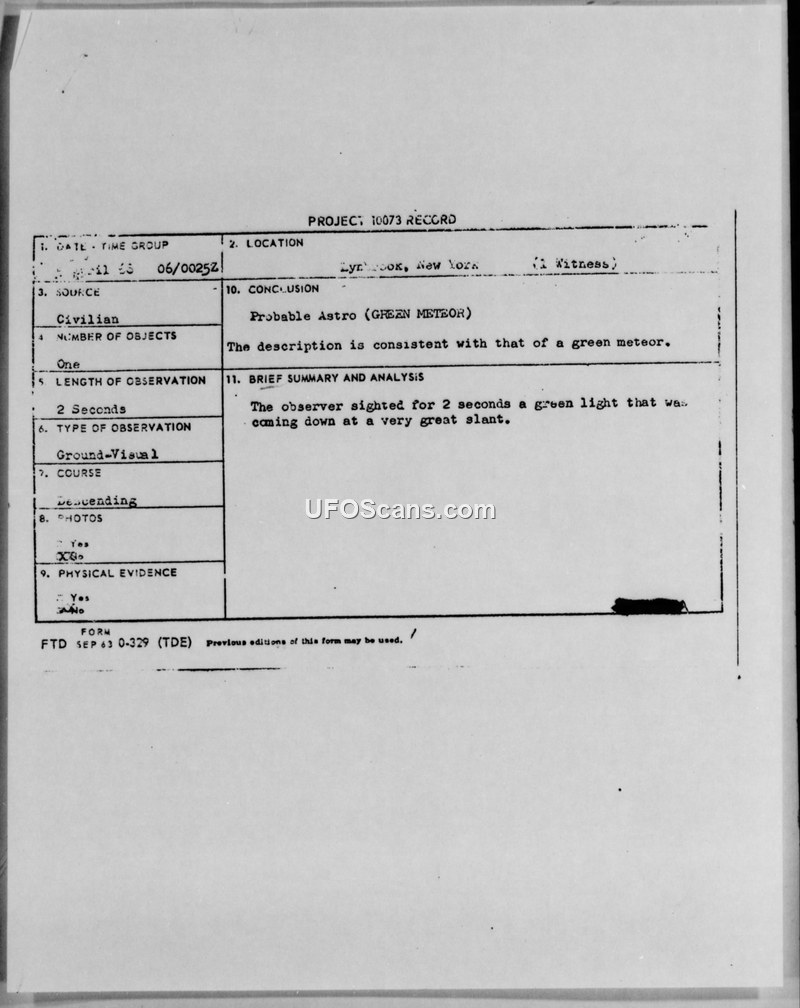 A 10-year-old witness reported a green, flat-topped object descending in the night sky over Lynbrook, New York, on April 5, 1968. The Air Force investigated the report and concluded the object was likely a green meteor.
