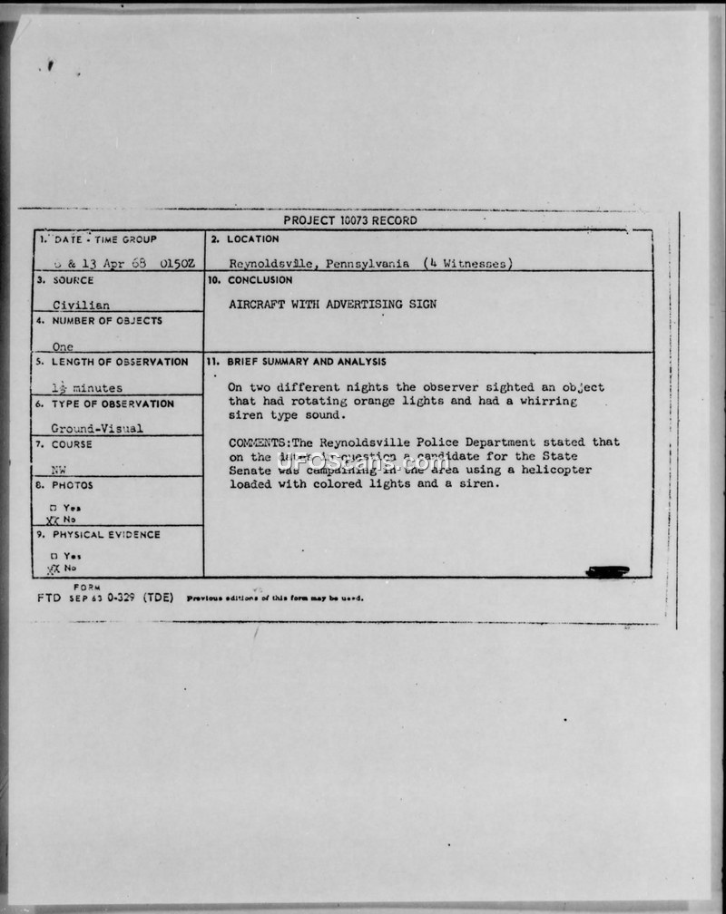 The sightings reported in Reynoldsville, Pennsylvania, on 6 and 13 April 1968 were identified as a helicopter used for political campaigning.