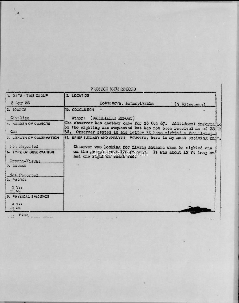 A civilian reported a 12-foot long object with lights on the ground in Pottstown, Pennsylvania, on October 26, 1967. The Air Force classified the report as unreliable and requested further documentation that was never received.