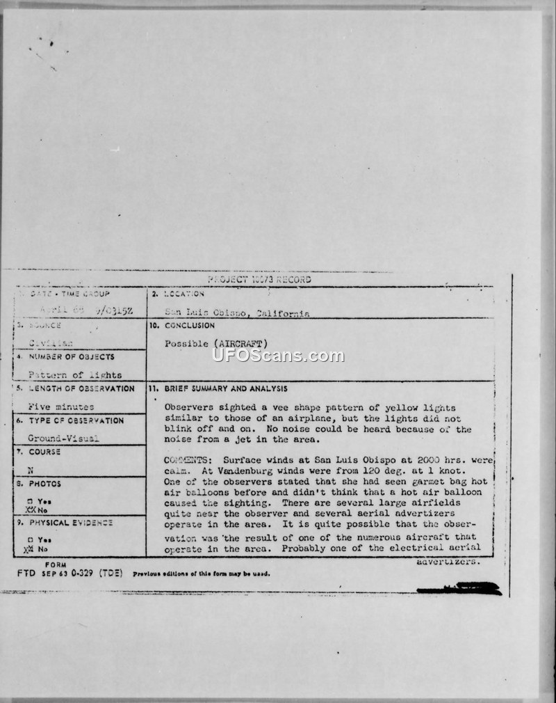 UFO Observation Report — San Luis Obispo, California, 8 April 1968