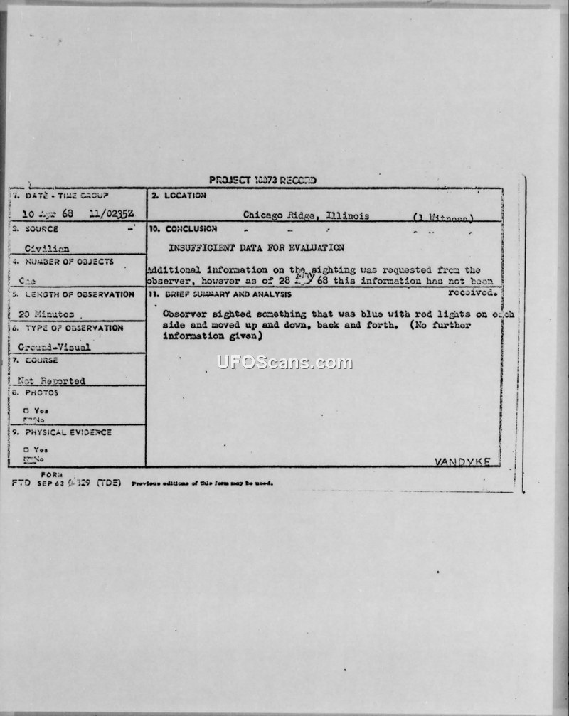 A single witness in Chicago Ridge, Illinois, reported a blue object with red lights on 11 April 1968. The Air Force investigation concluded there was insufficient data to evaluate the sighting after the witness failed to return a follow-up questionnaire.