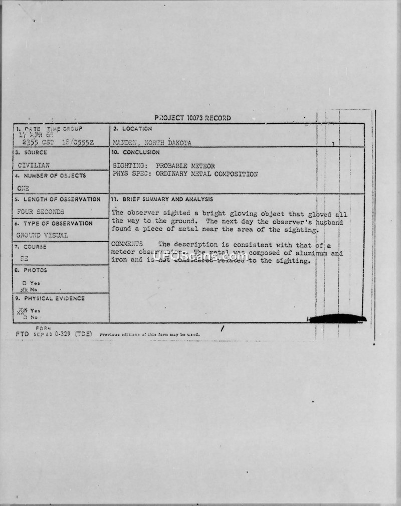 Project 10073 Record — Sighting Report, Mandan, North Dakota, April 17, 1968