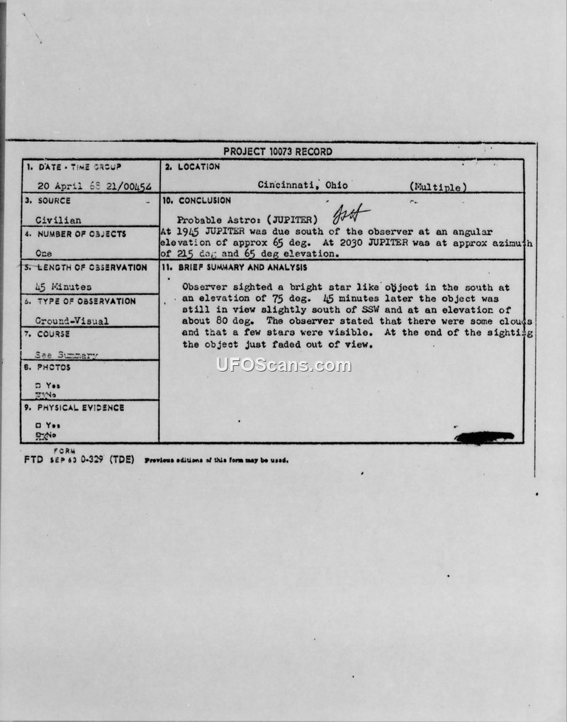 A 13-year-old witness reported a bright, star-like object in the sky over Cincinnati on April 20, 1968. The Air Force investigation concluded the object was the planet Jupiter.