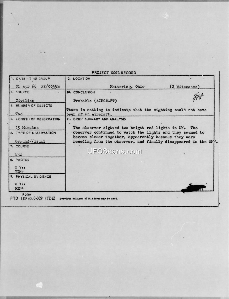 Project 10073 Record — Kettering, Ohio, 21 April 1968