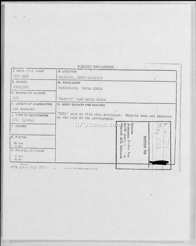 The Air Force investigated a UFO report from Columbia, South Carolina, in 1968. Analysis of the submitted photographs concluded that the alleged objects were merely water spots on the film.