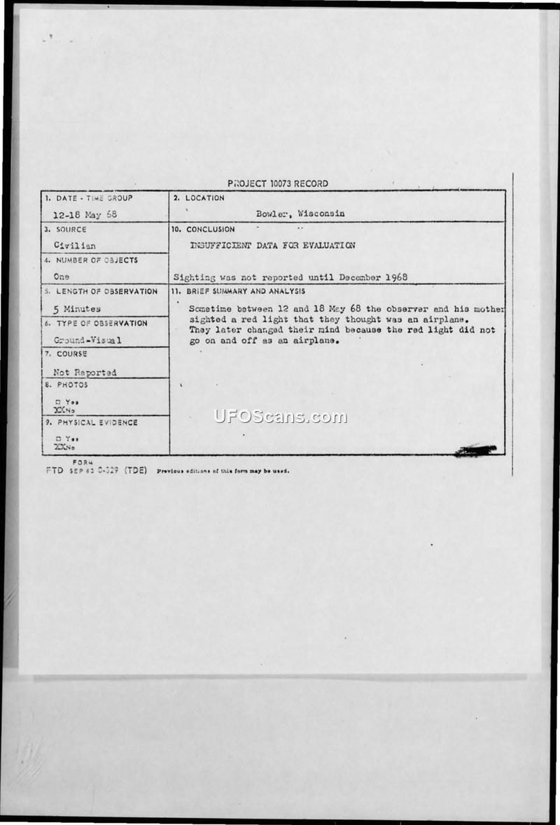 A 1968 sighting report from Bowler, Wisconsin, involving a red light observed for five minutes. The case was closed as having insufficient data for evaluation.